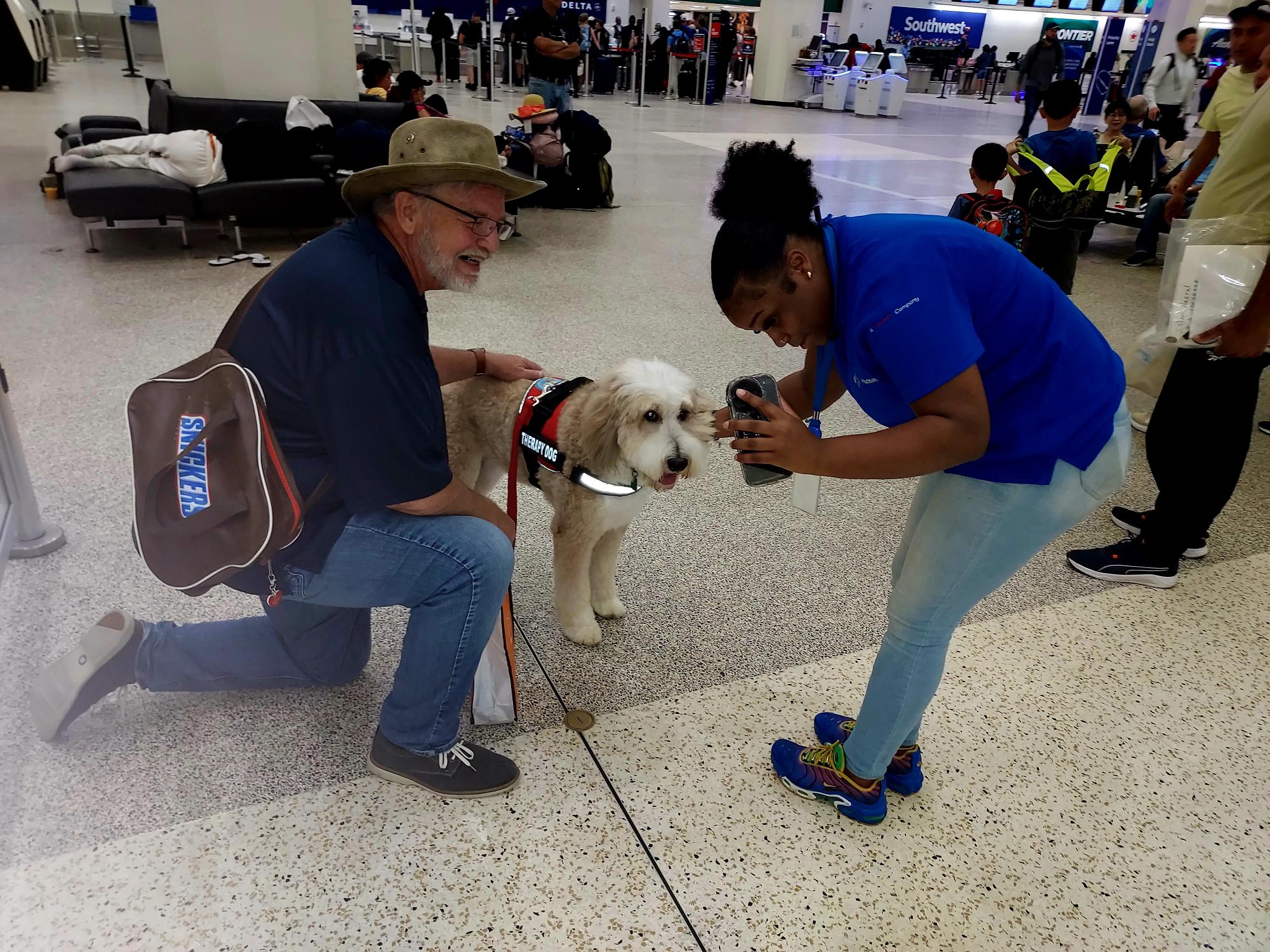 Kelly Woodward, Chief Operating Officer for Houston Airports, happened to meet Snickers as he was patrolling IAH Terminal A. “Incorporating amenities like our Pet Therapy program is crucial for easing the nerves of passengers of all ages,” said Woodward of the world-class passenger experience Houston Airports strives to deliver. “Traveling can be stressful, and by offering engaging experiences like meeting Snickers, we aim to enhance the overall travel experience and create a more pleasant environment for everyone.”